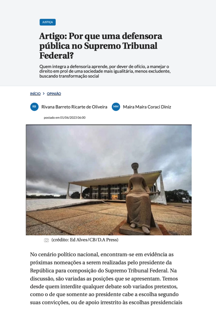 OLIVEIRA, Rivana; DINIZ, Maíra. Por Que Uma Defensora Pública no Supremo Tribunal Federal?. Distrito Federal: Diários Associados, 1 jun. 2023. Disponível em: https://staging.forumjustica.com.br/biblioteca/por-que-uma-defensora-publica-no-supremo-tribunal-federal/. Acesso em: 23 apr. 2026.