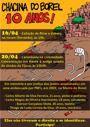 Abril de 2003, parecia que mais um capítulo dessa história de terror e medo estava sendo escrito. No final da tarde do dia 16 de Abril, quatro rapazes foram assassinados durante operação policial do 6º Batalhão de Polícia Militar (BPM) na comunidade do Borel, Zona Norte do Rio de Janeiro. Impedidos de se identificarem, Carlos Alberto da Silva Ferreira, pintor e pedreiro; Carlos Magno de Oliveira Nascimento, estudante; Everson Gonçalves Silote, taxista; e Thiago da Costa Correia da Silva, mecânico, foram atingidos na cabeça, tórax, braço e antebraço. O laudo cadavérico mostrou que os disparos foram efetuados à “queima roupa”.