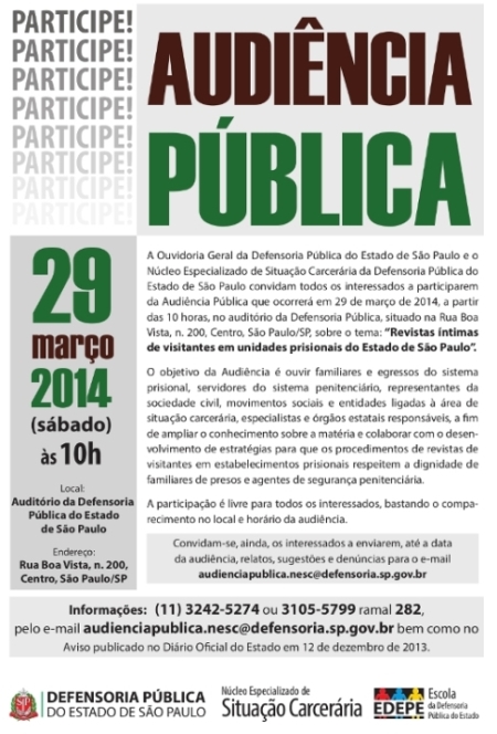 A Ouvidoria-Geral da Defensoria e o Núcleo Especializado de Situação Carcerária (NESC) promoverão uma Audiência Pública sobre a revista íntima nos estabelecimentos prisionais, na manhã do dia 29 de março, sábado, a partir das 10 horas, no auditório da Defensoria Pública, em São Paulo.