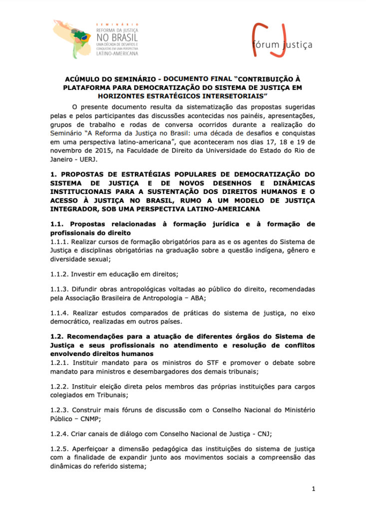 Acúmulo do Seminário A Reforma da Justiça no Brasil — Documento Final: Contribuição à Plataforma para Democratização do Sistema de Justiça em Horizontes Estratégicos Intersetoriais