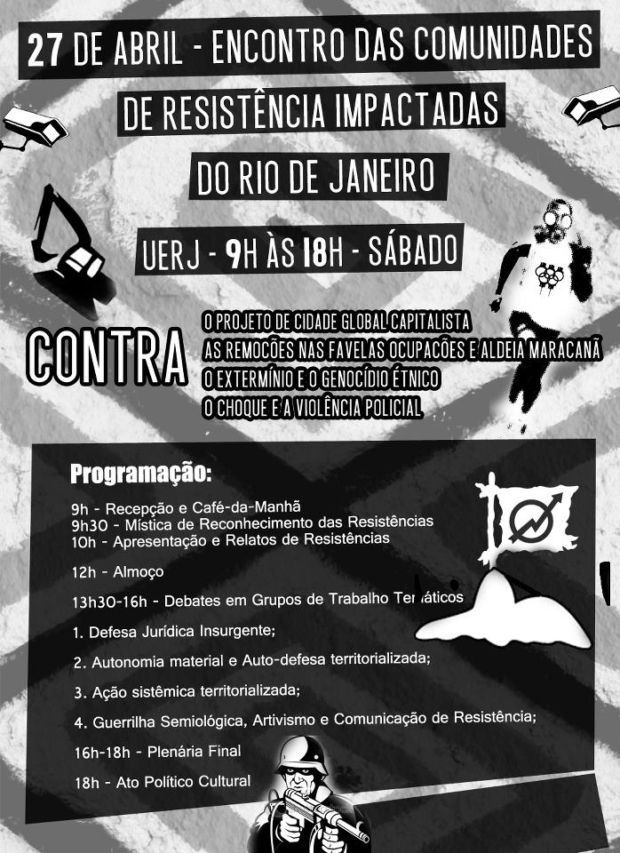 Informe da organização: O Encontro das Comunidades Impactadas que aconteceria hoje, 27 de abril, foi transferido para o dia 04 de maio, pois a polícia fechou a UERJ e tudo em torno como medida de segurança para reinauguração do Maracanã. Apareça, pois você é o protagonista deste encontro e das ações que surgirão! Nossa força vem da nossa união e ação política correta. Maracanã para quem? Cidade para quem? Trabalhar para quem?
