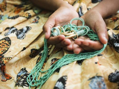 A., de 13 anos, segura sua guia sobre a saia baiana, símbolos do candomblé. Ela tem aulas obrigatórias de religião numa escola municipal de São João de Meriti Laura Marques