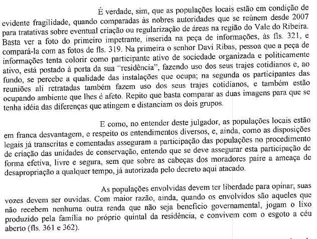 Infelizmente, a decisão foi encaminhada em cópia fotografada, o que impede a sua edição e publicação. Como, entretanto, é da maior importância socializar mais essa vitória de democratização da Justiça, o texto que abre esta notícia é exatamente a parte da conclusão que mais me encantou. Quem quiser lê-la na íntegra, pode baixá-la clicando AQUI. http://racismoambiental.net.br/wp-content/upLoads/2012/08/IPORANGA.pdf Fora isso, resta parabenizar todos os envolvidos nesse ato de defesa dos direitos das comunidades tradicionais. E comemorar, pois, como escreveu Toshio Hayama, este é um dia de felicidade. Para as comunidades, para a Justiça e para tod@s nós que lutamos por um mundo melhor!