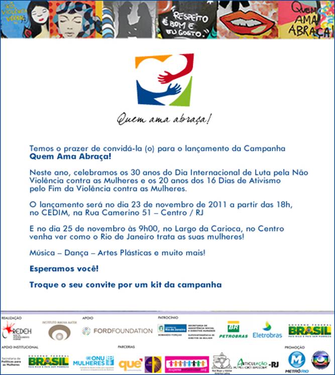 O lançamento da Campanha Quem Ama Abraça! Será no próximo dia 23 de novembro, quarta-feira, aqui no CEDIM. Onde assistirão de primeira mão, o vídeo da campanha que será veiculado na TV. O clipe contou com as participações de vários artistas, entre eles, Alcione, Ana Carolina, Beth Carvalho, Elba Ramalho, Teresa Cristina, Carlinhos Brown, Ed Motta, Lenine, Luiz Melodia e Martinho da Vila.