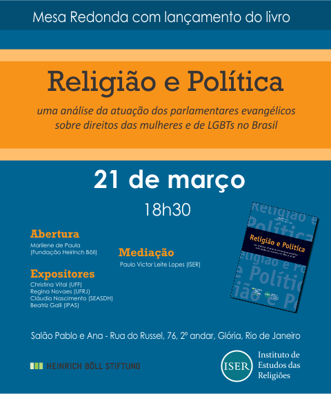 O Iser e a Fundação Heinrich Böll Brasil convidam para mesa redonda e lançamento do livro “Religião e Política: uma análise da atuação de parlamentares evangélicos sobre direitos das mulheres e de LGBTs no Brasil”, que será realizada no dia 21 de março, às 18h30.