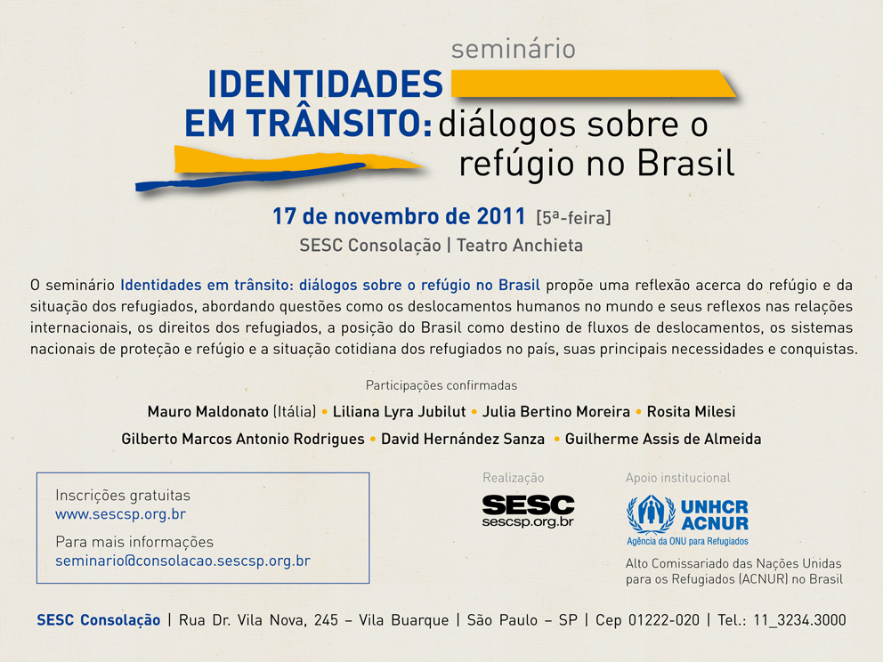O seminário “Identidades em transito: diálogos sobre o refugio no Brasil” propõe uma reflexão acerca do refúgio e da situação dos refugiados no Brasil, abordando questões como os deslocamentos humanos no mundo e seus reflexos nas relações internacionais, os direitos dos refugiados, a posição do Brasil como destino de fluxos de deslocamentos por perseguição, os sistemas nacionais de proteção e refúgio e a situação cotidiana dos refugiados no país, suas principais necessidades e conquistas.
