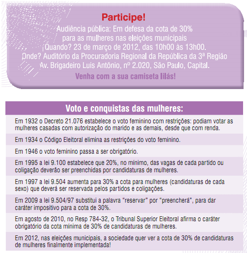 Em 2012, faz 80 anos que as mulheres conquistaram o direito ao voto feminino. Em 2010, foi eleita a primeira presidenta do Brasil. Muitas mulheres são lideranças políticas nas associações de bairro, nos movimentos sociais e sindicatos. Pesquisa do Ibope- Instituto Patrícia Galvão revela que 9 em cada 10 pessoas estão dispostas a votar em mulheres para qualquer cargo.
