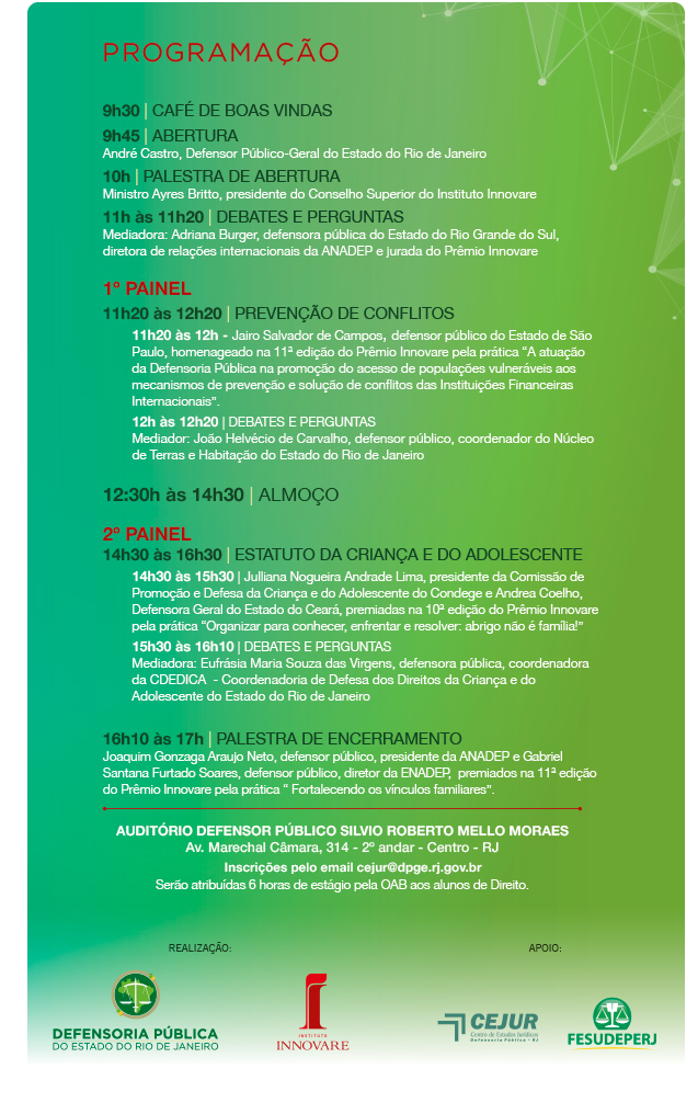 Seminário na Defensoria Pública contará com palestra do Ministro Ayres Britto, que é sempre inspiradora e com a apresentação da práticaprevenção de conflitos envolvendo populações vulneráveis e instituições financeiras internacionais”, com o defensor público de São Paulo Jairo Salvador, que atuou de forma combativa e incansável no caso de Pinheirinho. A prática ganhou menção honrosa no Premio Innovare, e é um excelente mecanismo que pode ser utilizado para defesa do direito à moradia e à cidade. Ao ter por alvo o financiamento da política pública, tem permitido solução de conflitos de grande dimensão social.  Na parte da tarde, haverá um painel sobre defesa da criança e do adolescente, com apresentação de práticas das defensorias públicas do Ceará e do Maranhão. Participem!