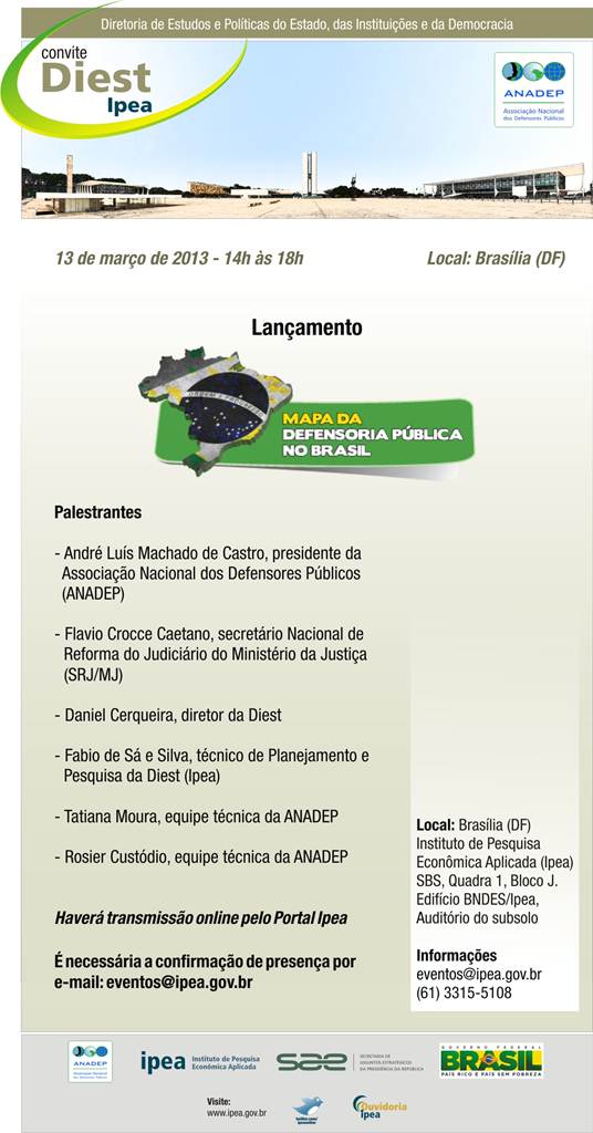 No próximo dia 13 de março, em parceria com o IPEA, a ANADEP lançará o Mapa da Defensoria Pública no Brasil. O evento será realizado no auditório do IPEA, em Brasília, a partir das 14 horas, com a presença de defensores públicos de todo o Brasil, de representantes do sistema de justiça e da imprensa.