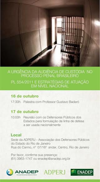 Nos próximos dias 16 e 17 de outubro, a ANADEP, em parceria com a Escola Nacional dos Defensores Públicos (ENADEP) e a Associação dos Defensores Públicos do Rio de Janeiro (ADPERJ), discutirá, na sede da ADPERJ, o PLS 554/2011, de autoria do senador Antonio Calos Valadares (PSB/SE), por meio do painel “A Urgência da Audiência de Custódia no Processo Penal Brasileiro PL 554/2011 e estratégia de atuação em nível nacional”. O evento é aberto aos defensores que podem confirmar participação por meio do email: enadep@anadep.org.br, com o assunto: Audiência de Custódia, ou pelo telefone: 61 3963-1747.