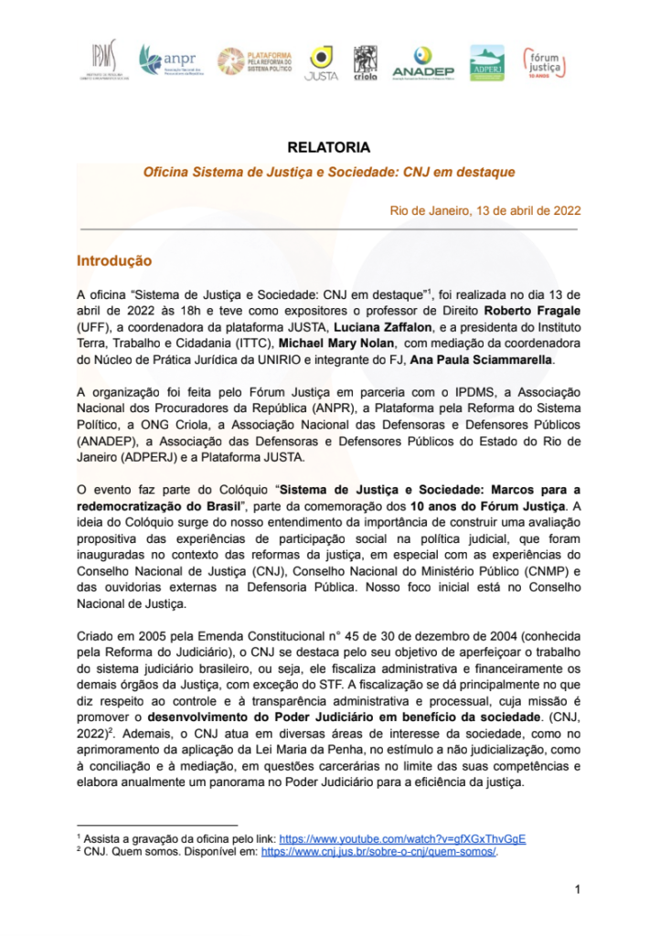 FÓRUM JUSTIÇA, et al. (2022). Oficina Sistema de Justiça e Sociedade: CNJ em Destaque. Acesso em 24 apr. 2026, disponível em https://staging.forumjustica.com.br/es/biblioteca/relatoria-oficina-sistema-de-justica-e-sociedade-cnj-em-destaque/.