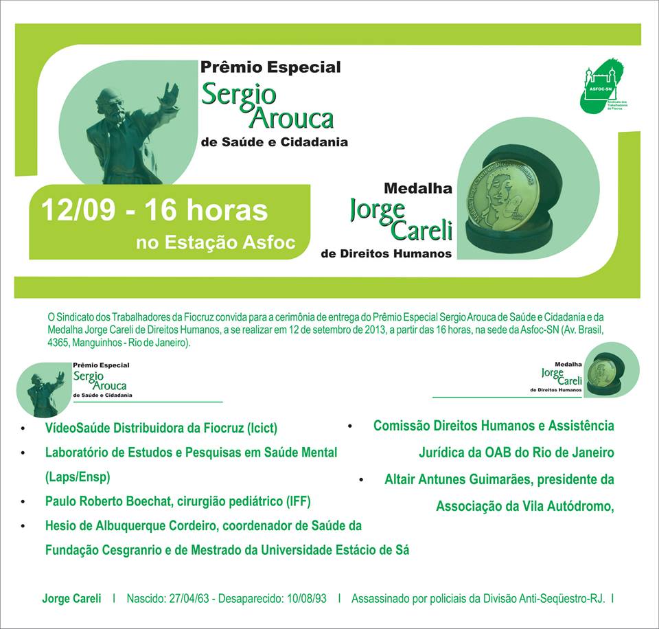 Vinte anos depois do desaparecimento do servidor da Fundação Oswaldo Cruz Jorge Careli (10/08/1993), o Sindicato dos Trabalhadores da Fiocruz (Asfoc-SN) homenageará com a Medalha Careli de Direitos Humanos a Comissão de Direitos Humanos e Assistência Jurídica da OAB do Rio de Janeiro e a Associação de Moradores da Vila Autódromo.