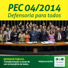 PEC Defensoria para Todos chega ao Senado: Conforme prometido pelo presidente Henrique Eduardo Alves, a PEC Defensoria para Todos chegou ao meio-dia desta quinta-feira (13) ao Senado. A proposta, que já foi lida em plenário, segue para a CCJ para designação de relator, agora tramitando com nova numeração: PEC 04/2014 – Defensoria para Todos.