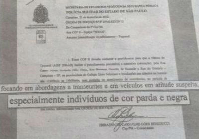 Um documento com teor racista, assinado pelo capitão da Polícia Militar de São Paulo Ubiratan de Carvalho Góes Beneducci, veio à tona nesta quarta-feira 23 e gerou revolta de organizações de Direitos Humanos e de igualdade racial. O documento, divulgado pelo jornal Diário de São Paulo, orienta policias que trabalham no bairro Taquaral, região nobre de Campinas, a abordarem com rigor pessoas “em atitude suspeita, especialmente indivíduos de cor parda e negra”. Segundo o jornal, a determinação é adotada por policiais desde o dia 21 de dezembro do ano passado e é direcionada principalmente para jovens entre 18 e 25 anos, que estejam em grupos de três a cinco pessoas e tenham a pele escura.