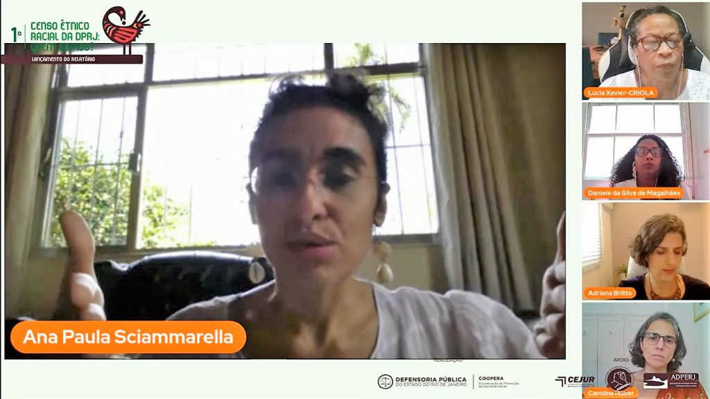 Ana Paula lembrou da trajetória do FJ, ao lado da ONG Criola, de construção de documentos e estratégias de debates sobre esse tema, em especial do sistema de justiça, como a já citada pesquisa pelo defensor público-geral e a mais recente coletânea “Racismo Institucional e o Sistema de Justiça”.