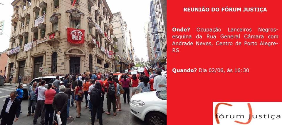O Fórum Justiça no Rio Grande do Sul convida para a próxima reunião, que ocorrerá na Ocupação Lanceiros Negros, dia 02 de junho, às 16:30.