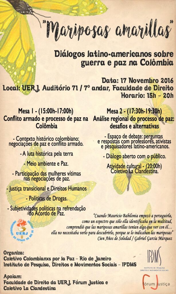 Em parceria com o Coletivo Colombianxs por la Paz-RJ e o IPDMS, o Fórum organizou o seminário “Mariposas Amarillas: Diálogos latino-americanos sobre guerra e paz na Colômbia”, para discutir os impactos do processo de paz na Colômbia no contexto da América Latina. A jornada reuniu centros acadêmicos e movimentos sociais interessados na conjuntura colombiana e chamou atenção para processos e desafios em comum entre a Colombia e o Brasil.