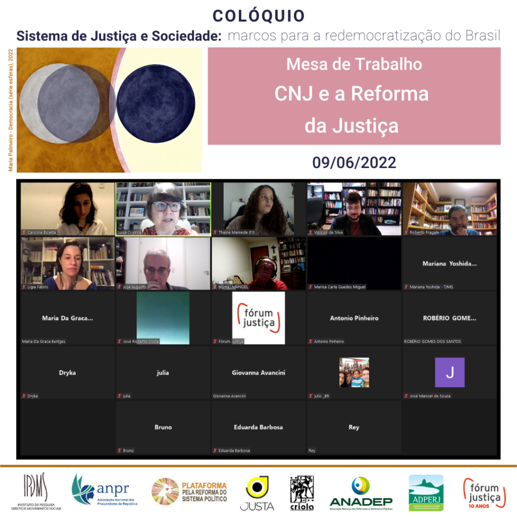 Dando continuidade ao ciclo de debates sobre o Conselho Nacional de Justiça (CNJ), no escopo do Colóquio Sistema de Justiça e Sociedade: marcos para a democratização do Brasil, a mesa CNJ e Reforma da Justiça ocorreu nesta quinta-feira (09/06) pela plataforma ZOOM.