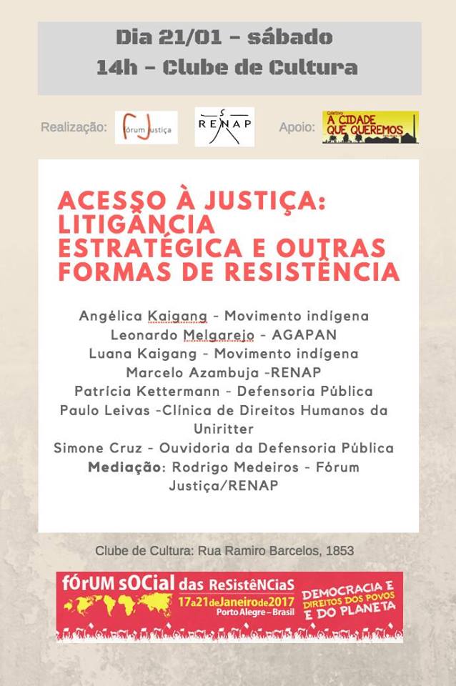 Em parceria com a RENAP e o Coletivo A Cidade que Queremos, o Fórum Justiça organizou a mesa redonda “Acesso à Justiça: Litigância Estratégica e Outras Formas de Resistência” no âmbito do Fórum Social das Resistências, ocorrido nesse mês de janeiro, na cidade de Porto Alegre.