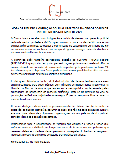 Nota de Repúdio do Fórum Justiça à Operação na Comunidade do Jacarezinho