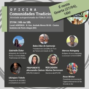 Logo depois, às 16h, acontece a oficina “Comunidades Tradicionais”, com participação de diversos movimentos sociais, com apoio do FJ.
