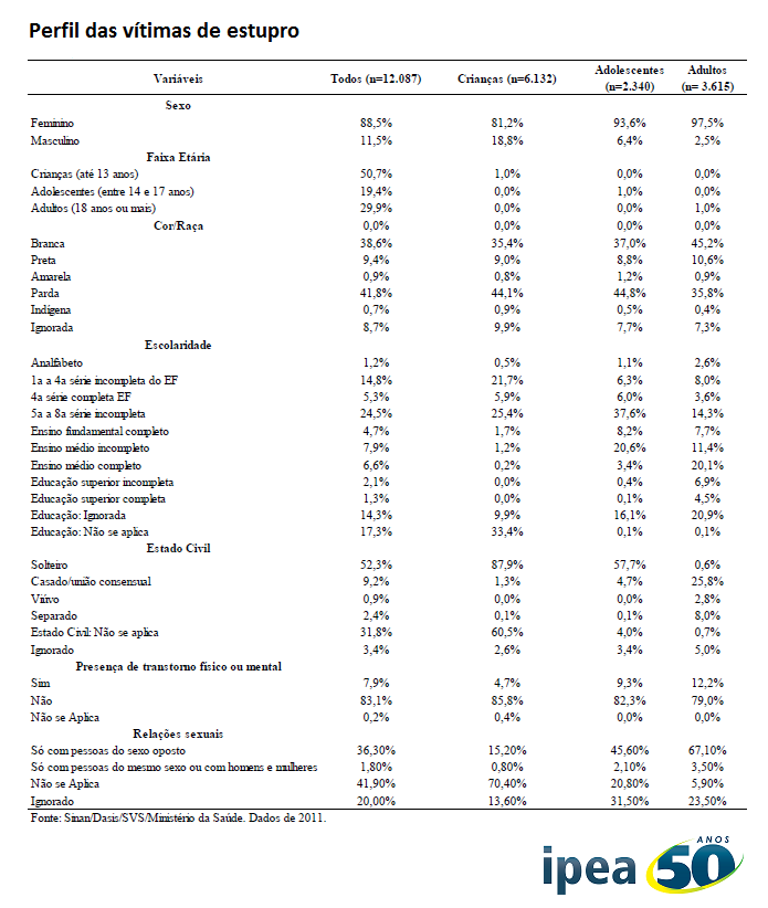Metade das vítimas de estupro no Brasil tem menos de 13 anos. 88% delas são mulheres, de acordo com levantamento do Ipea, feito com base em dados do Ministério da Saúde.Leia mais sobre a pesquisa ‘Estupro no Brasil: uma radiografia segundo os dados da Saúde’, apresentada nesta quinta-feira |