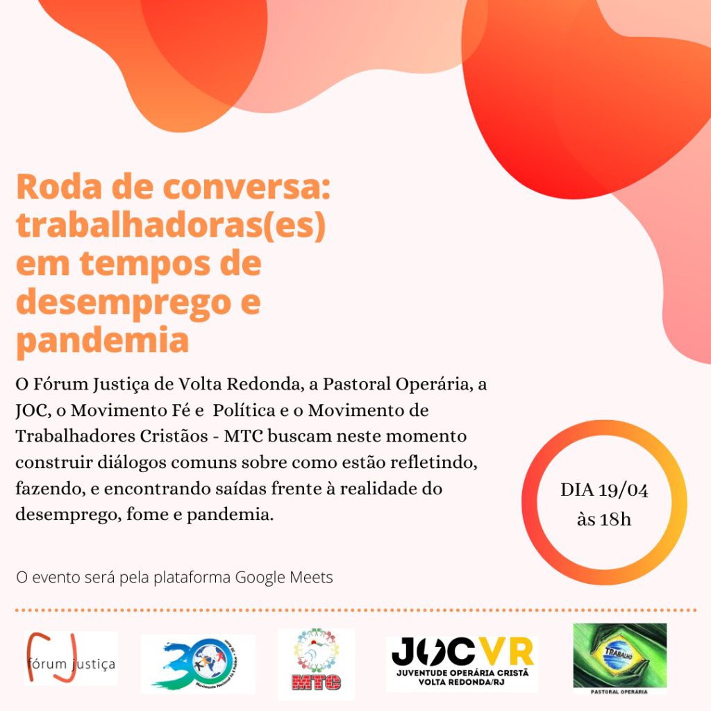 No dia 19 de abril de 2021, o Fórum Justiça promoveu a roda de conversa “Trabalhadoras(es) em Tempo de Desemprego e Pandemia”, que contou com a participação das lideranças do Movimento Fé e Política, Movimento dos Trabalhadores Cristãos, Pastoral Operária e a Juventude Operária Católica. O objetivo foi construir diálogos sobre a situação dos trabalhadores de Volta Redonda no atual cenário de desemprego e pandemia, e assim, pensar conjuntamente em soluções.
