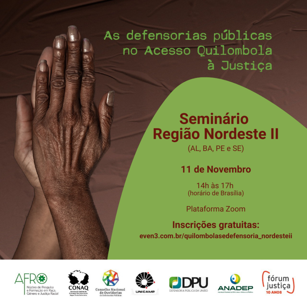 Para encerrar o ciclo de seminários do projeto “Quilombos e acesso à justiça: atuação da Defensoria Pública”, no dia 11/11 (sexta-feira) às 14h (horário de Brasília), escutaremos as lideranças quilombolas da região Nordeste II (AL, BA, PE e SE).  Assim como nos encontros anteriores, o evento será pela plataforma Zoom.